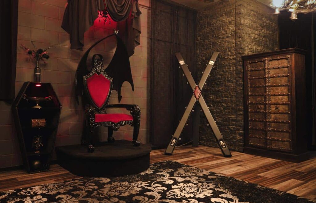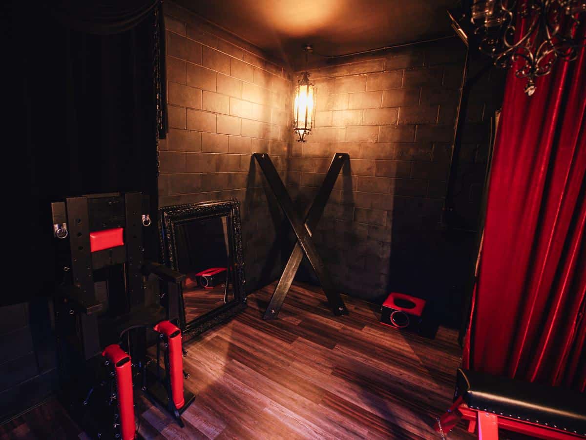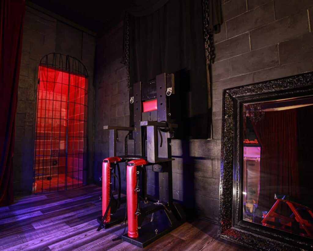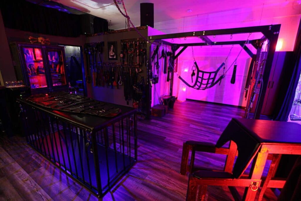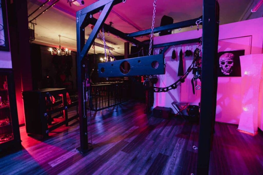 -Full suspension rack with leather sex swing and multiple bondage points.